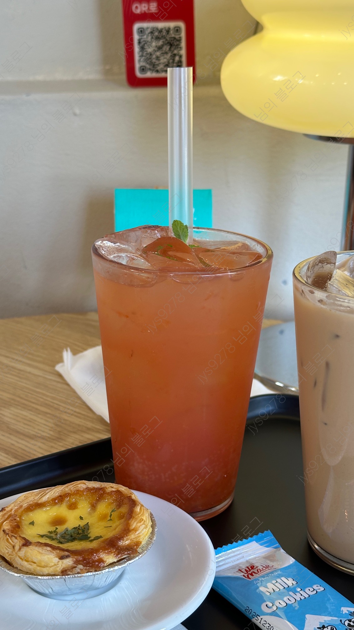 플라우드 라떼(헤이즐 모카라떼), 레드자몽 에이드, 에그타르트 입니다.