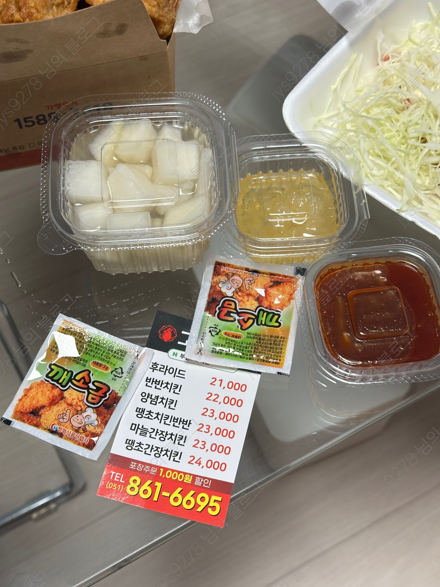 그리고 치킨무, 양념소스, 깨소금, 마늘참기름 소스 !