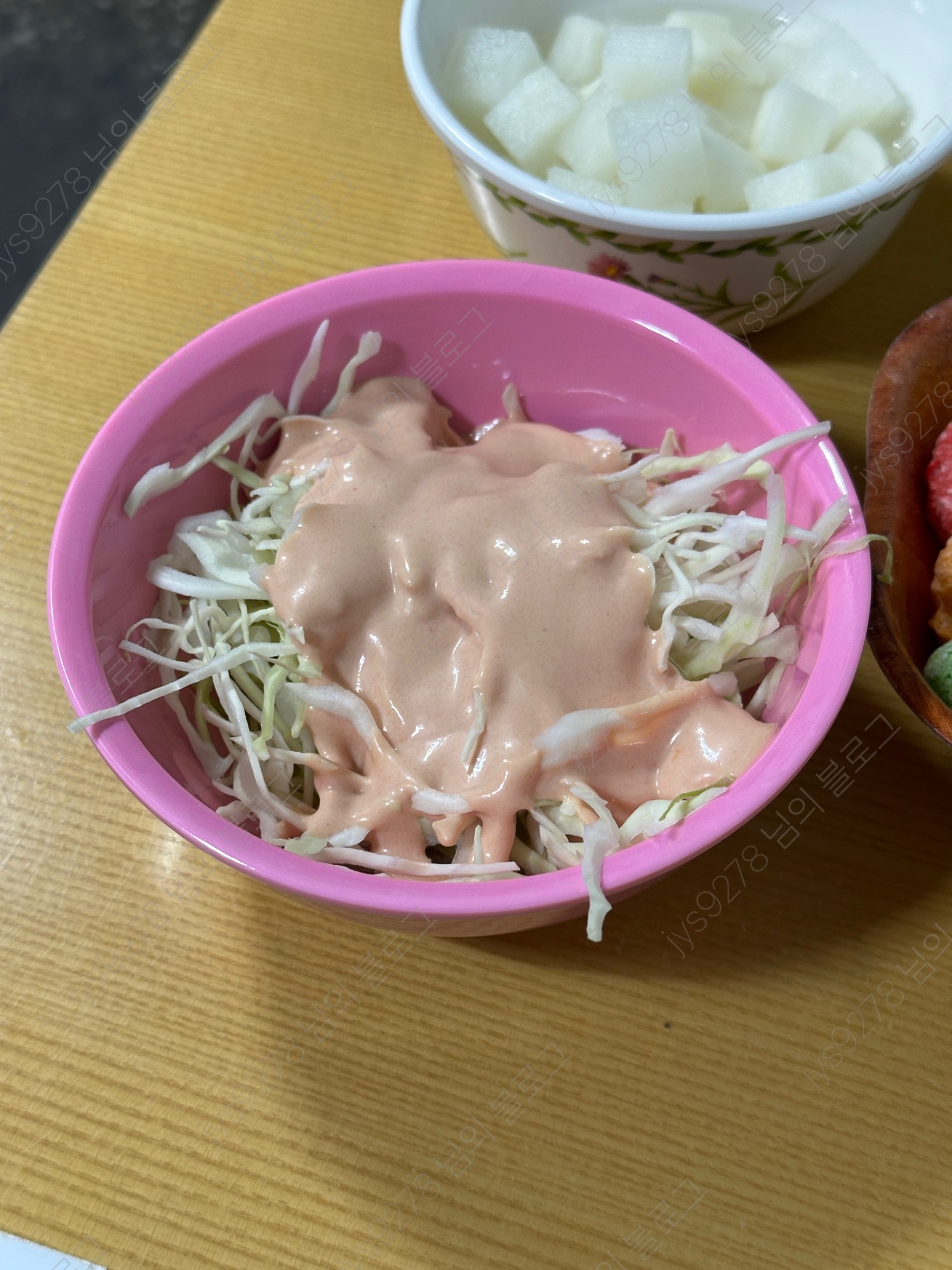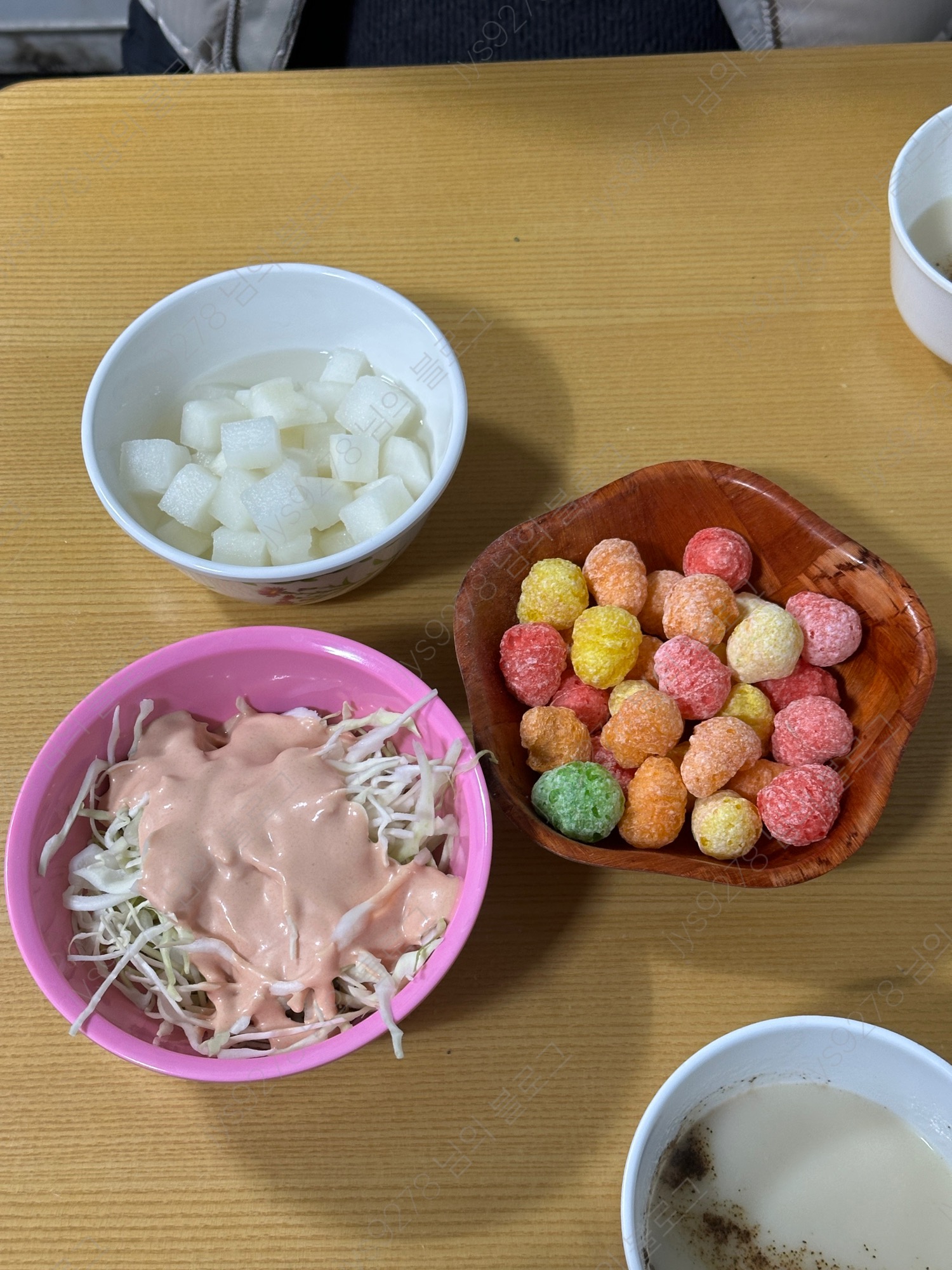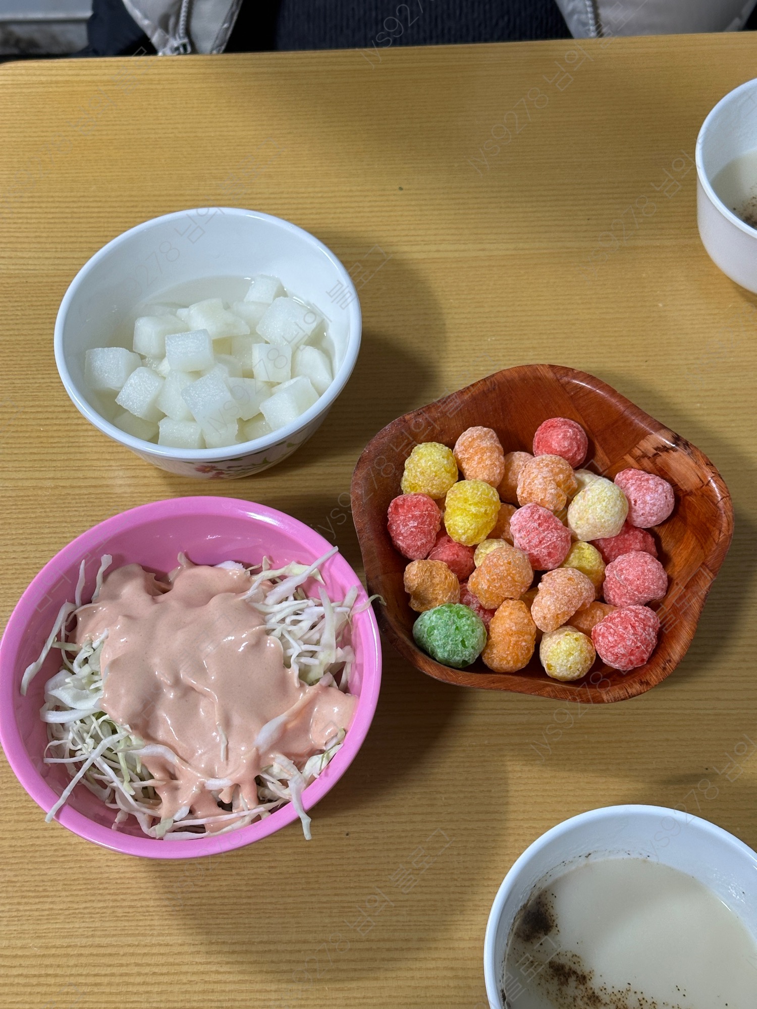 무지개 뻥튀기와 양배추 사라다와 치킨무