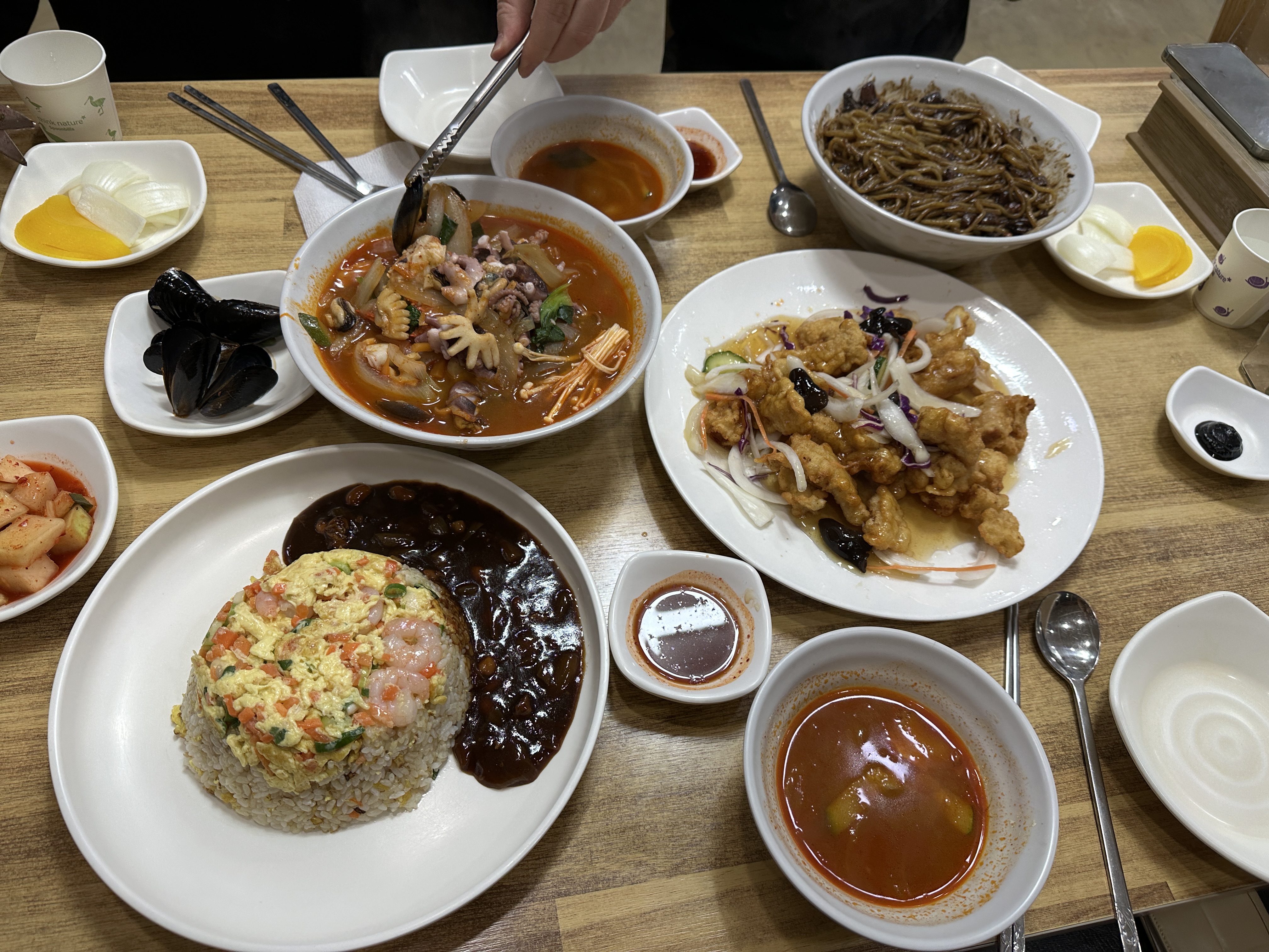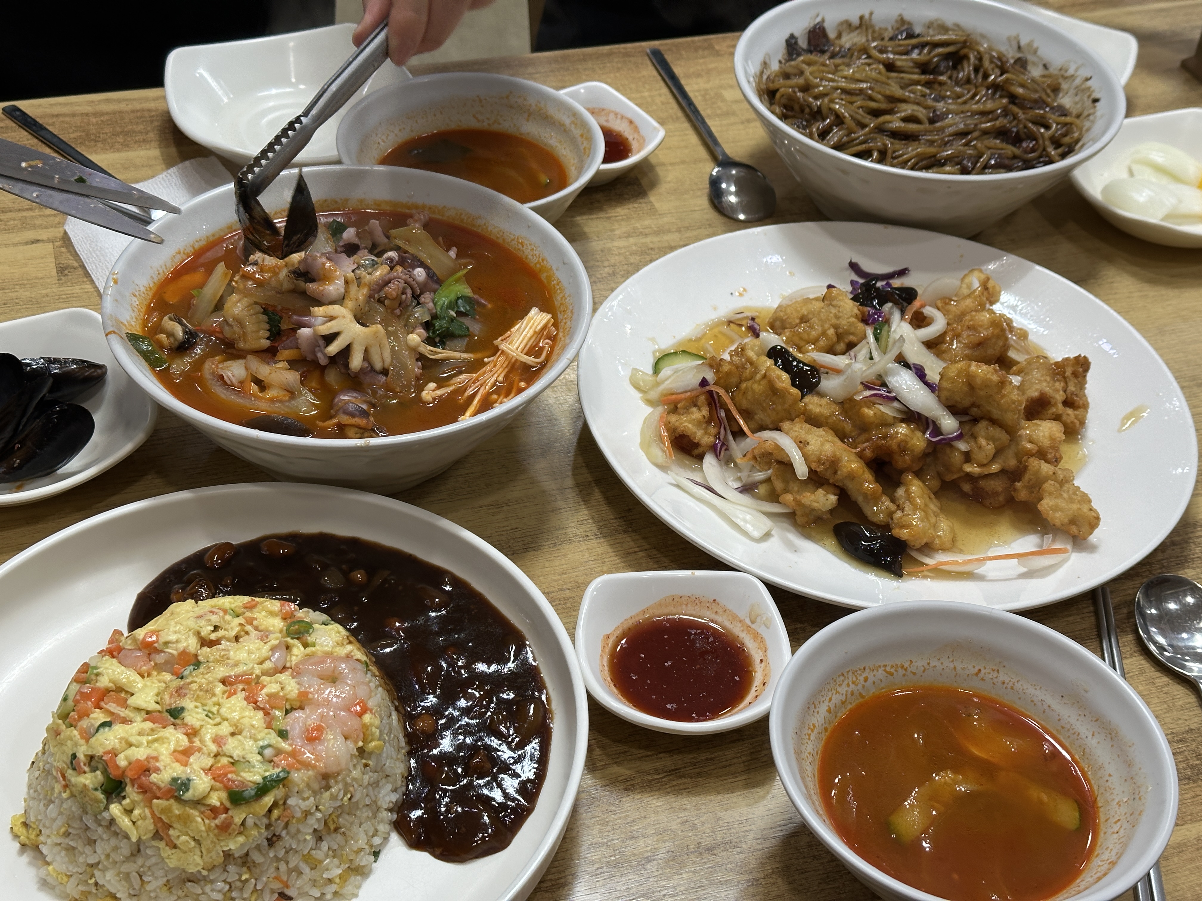 간짜장 곱배기, 새우볶음밥 곱배기, 해물왕짬뽕 곱배기,탕수육 중자로 주문 완료!