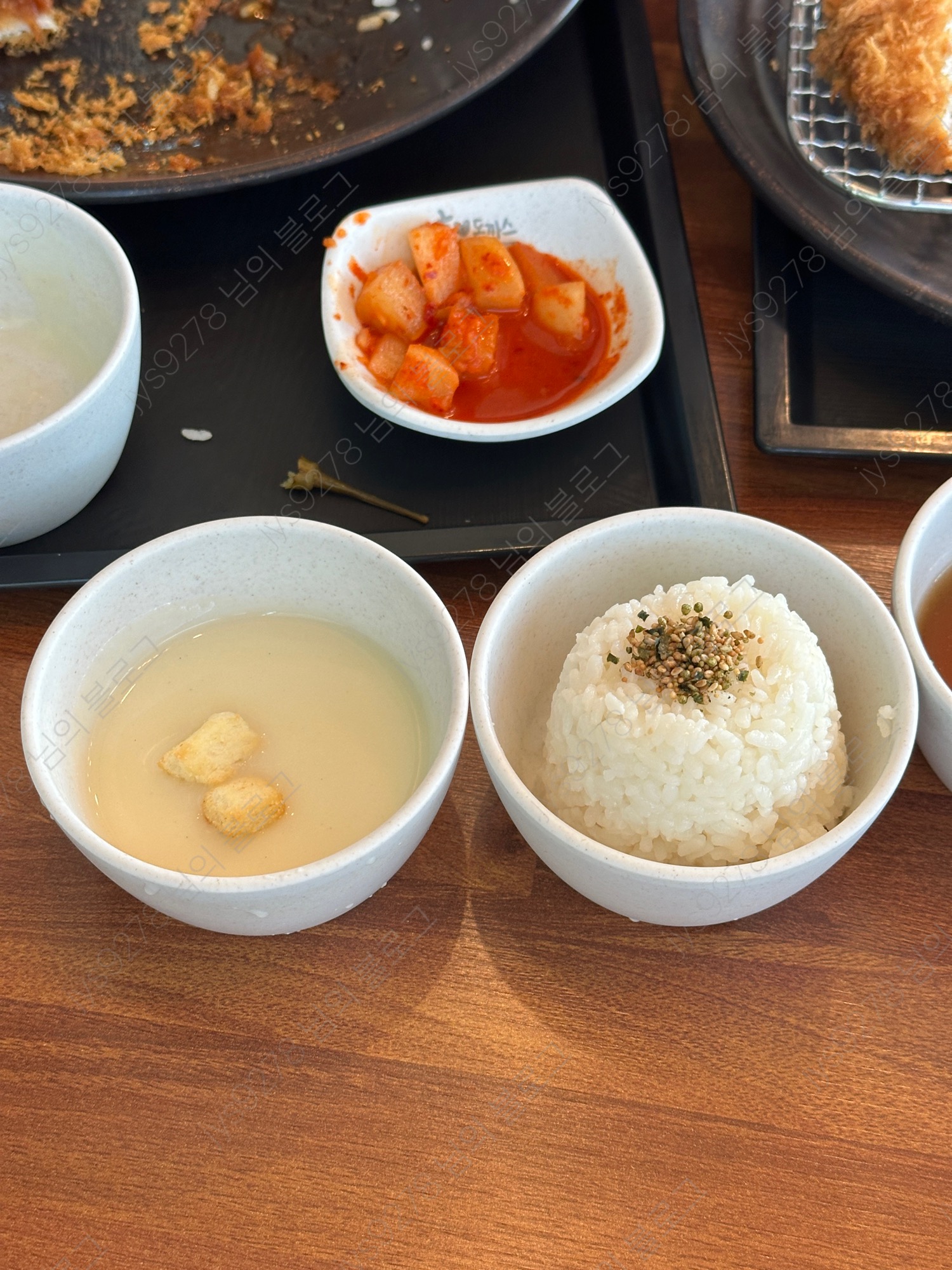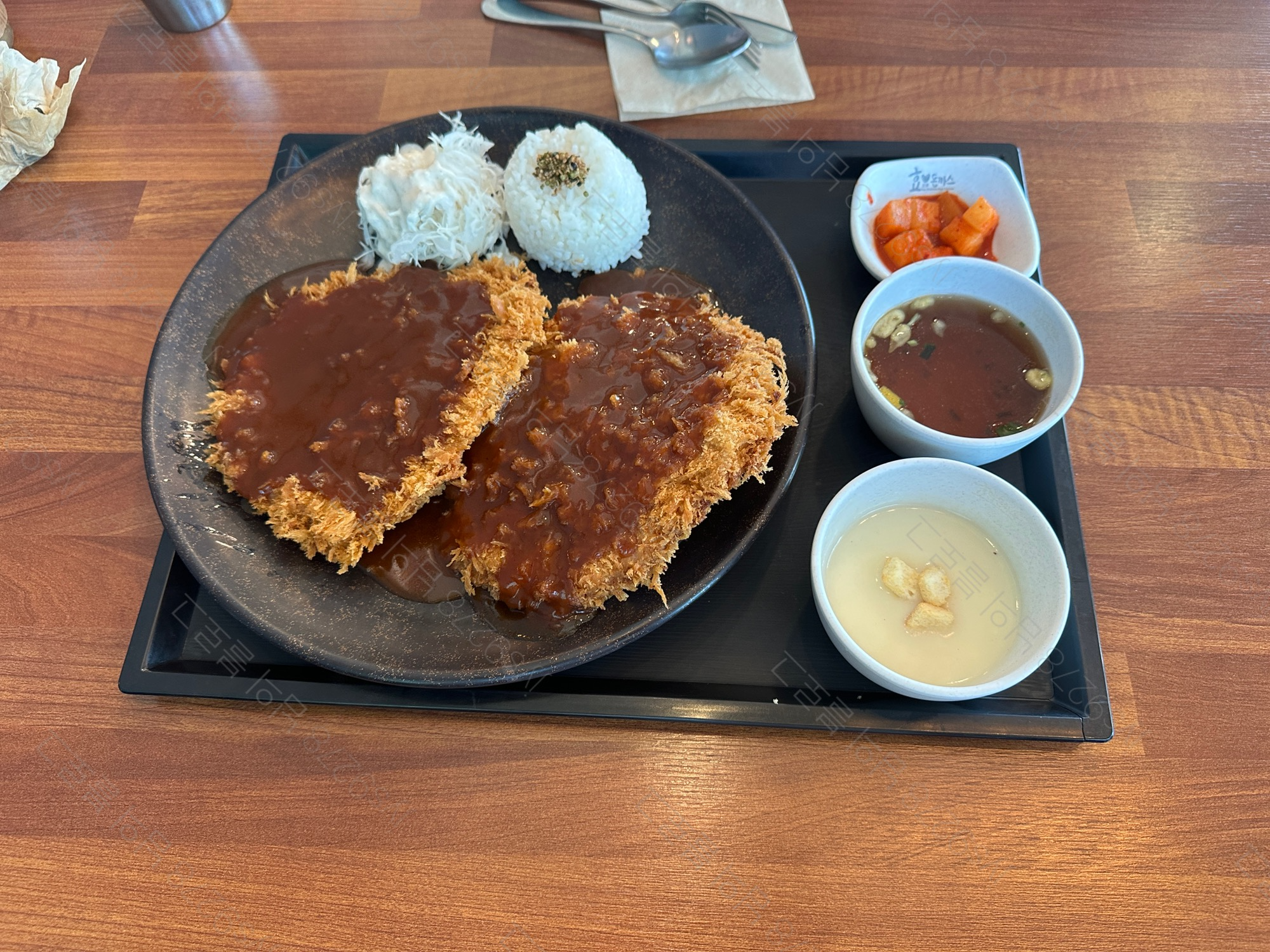 큼지막한 돈까스 2개와 밥, 샐러드, 깍두기, 국, 스프로 구성되어 있습니다 ㅎㅎ