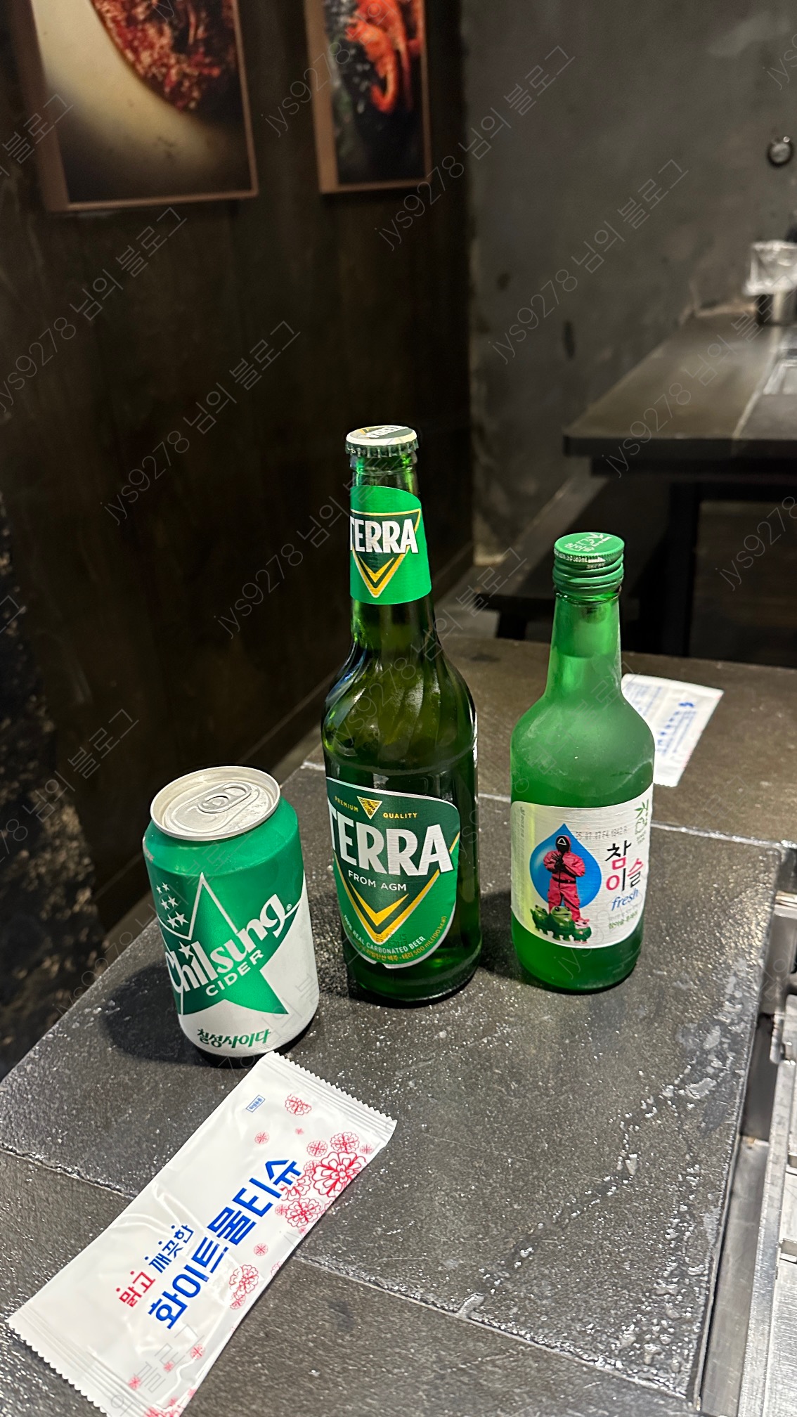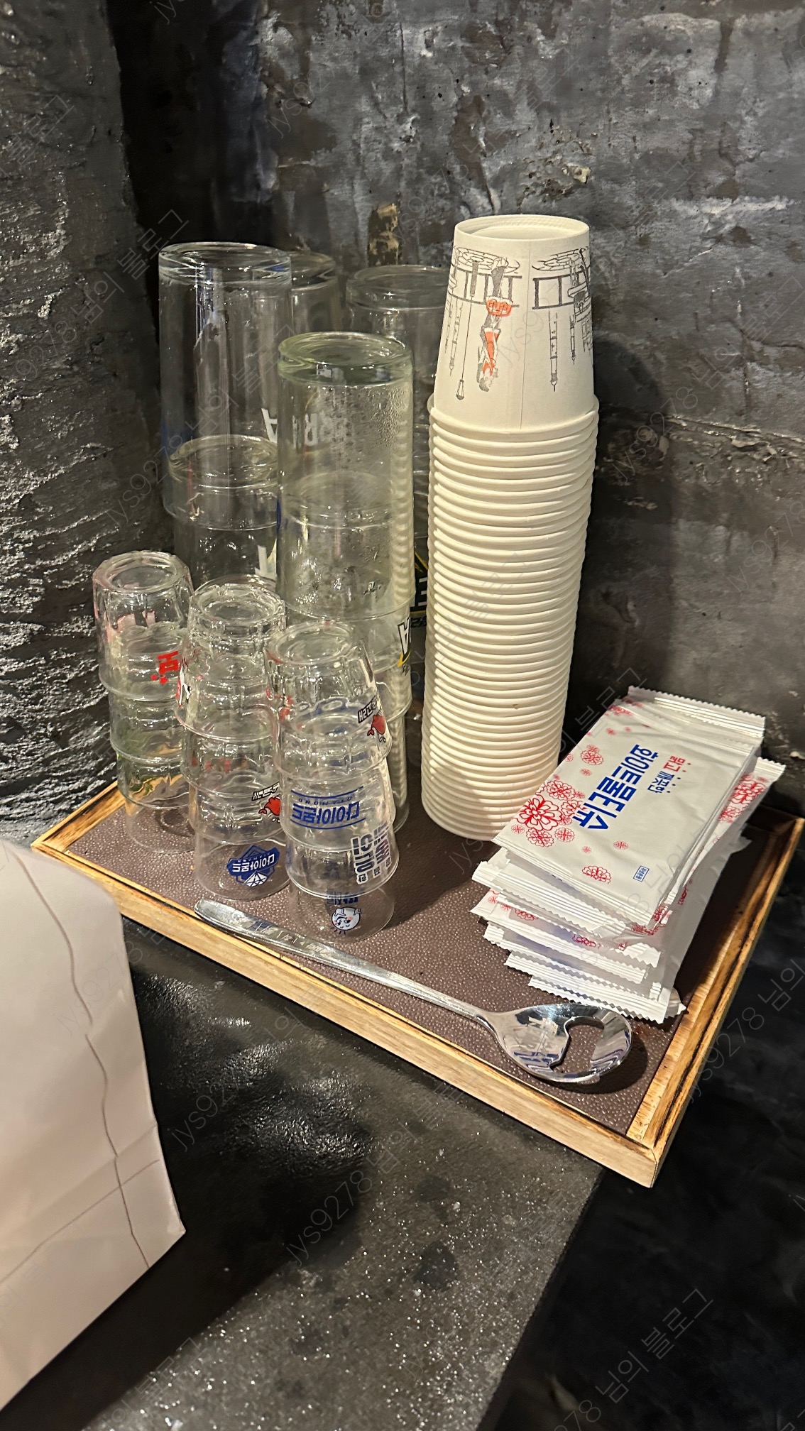 테이블마다 요렇게 잔과 물티슈 등 세팅돼있구요!